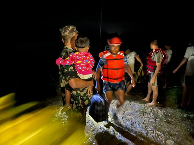 काठमाडौं, असोज २० – देशभर विगत दुई दिनदेखि निरन्तर भइरहेको अविरल वर्षाका कारण विभिन्न स्थानमा जनजीवन प्रभावित भएको छ। यसैबीच, सुरक्षाकर्मीहरूको सक्रियतामा प्रभावित क्षेत्रमा उद्धार तथा राहत वितरण कार्य तीव्र रुपमा अगाडि बढिरहेको छ।