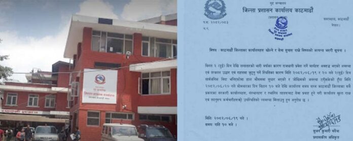 जिल्ला प्रशासन कार्यालय काठमाडौंले जारी गरेको गरेको ‘काठमाडौं जिल्लाका कार्यालयहरू खोल्ने र सेवा सुचारु राख्ने विषयको अत्यन्त जरुरी सूचना’ मा सो कुरा उल्लेख छ ।