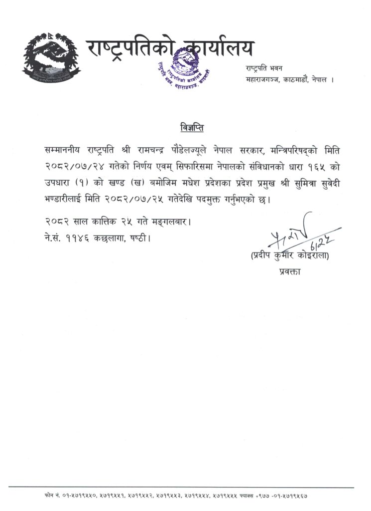 काठमाडौं । मधेश प्रदेशकी प्रदेश प्रमुख सुमित्रा सुवेदी भण्डारी पदमुक्त हुनुभएको छ। राष्ट्रपति रामचन्द्र पौडेलले मन्त्रिपरिषद्को निर्णय तथा सिफारिसका आधारमा नेपालको संविधानको धारा १६५ को उपधारा (१) को खण्ड (ख) बमोजिम भण्डारीलाई पदमुक्त गर्नुभएको हो। राष्ट्रपतिद्वारा गरिएको उक्त निर्णय मङ्गलबारदेखि लागू हुने जनाइएको छ।