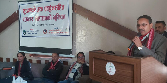 काठमाडौं । सुशासन प्रवर्द्धनमा सञ्चारकर्मीको महत्वपूर्ण भूमिका हुने भएकाले सूचनाको हकलाई उपयोग गरी हरेक किसिमका अनियमितता रोक्नेतर्फ नै पत्रकारले आफूलाई क्रियाशील राख्नुपर्नेमा जोड दिइएको छ ।
