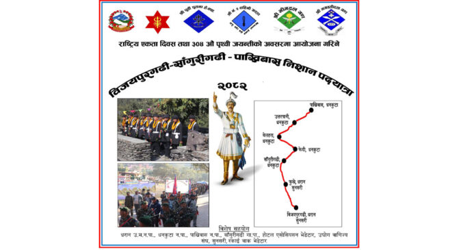 काठमाडौं । नेपाली सेनाले राष्ट्रि एकता दिवस तथा ३०४ औं पृथ्वी जयन्तीको अवसरमा पदयात्रा तथा दौड प्रतियोगिता गर्ने भएको छ । सेनाले सुनसरीको विजयपुरगढी देखी धनकुटाको साँगरीगढी दोेड प्रतियोगिता तथा पत्रदयात्रा गर्न लागेको हो । सेनाले पुस २७ गतेदेखि ३० गतेसम्म पदयात्रा र दौड प्रतियोगिता गर्न लागेको हो । पदयात्रा सुनसरीको ऐतिहासिक स्थल विजयपुरगढी देखी सुरुभई धराको फुस्रे हुँदै धनकुटाको साँगुरीगढी, बेलहरा उत्तरपानी हुँदै पाख्रिबासमा गएर समापन हुने छ । धनकुटाको ऐतिहासिक तथा सांस्कृतिक सम्पदा संरक्षण गर्दै प्रवर्धन गर्ने उद्देश्यले कार्यक्रम गर्न लागिएको भीमदल गण सल्लेरी धनकुटाका गणपती गणेश थापाले जानकरी दिनुभयो ।