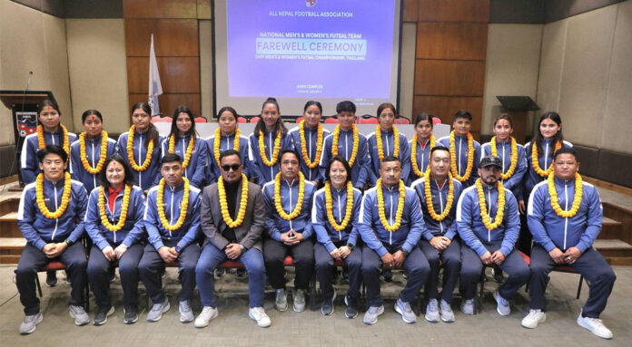 काठमाडौं । थाइल्यान्डमा जनवरी १३ देखि २६ तारिखसमम आयोजना हुने साफ फुटसल च्याम्पियनसिपका लागि नेपालको पुरुष र महिला टोलीको बिदाइ गरिएको छ । अखिल नेपाल फुटबल सङ्घ (एन्फा) ले शुक्रबार खेलाडी टोलीको बिदाइ गरेको हो । टोलीलाई एन्फा अध्यक्ष पङ्कजविक्रम नेम्वाङलगायत पदाधिकारीले शुभकामनासहित बिदाइ गर्नुभयो । नेपालले पहिलो पटक साफ स्तरीय फुटसल च्याम्पियनसिप खेल्न लागेको हो । नेपाली महिला टोलीका लागि यो पहिलो अन्तर्राष्ट्रिय फुटसल च्याम्पियनसिप समेत हो । बिदाइको अवसरमा दुवै टोलीले उपाधिका लागि प्रतिस्पर्धा गर्ने दाबी गरेका थिए । गोरखापत्र