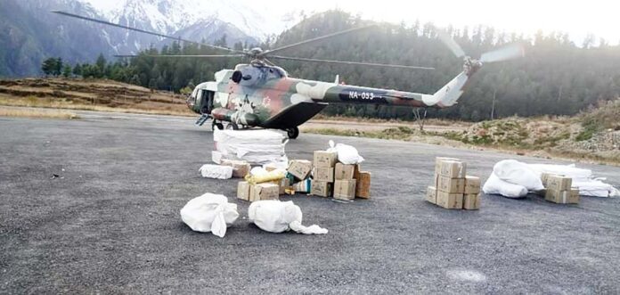 काठमाडौं । हुम्लाको उत्तरी नाम्खा गाउँपालिका–४, चाला र वडा नं–६ लिमीका तीन मतदान केन्द्रका कर्मचारी र सुरक्षाकर्मी तथा निर्वाचन सामग्री नेपाली सेनाको हेलिकाेप्टरमा ढुवानी भइरहेको छ । चार मतदान केन्द्रमा खटिएका १०२ कर्मचारी, सुरक्षाकर्मी र निर्वाचन प्रहरीलाई हेलिकाेप्टरमा त्यसतर्फ पठाइएको सहायक प्रमुख जिल्ला अधिकारी राजेन्द्रकुमार चन्दले बताउनुभयो । कर्मचारी र सुरक्षाकर्मीलाई पैदल भएर जाँदा असहज हुने भएपछि निर्वाचन आयोगले हिमाली जिल्लाका मतदान केन्द्रमा हेलिकाेप्टरको व्यवस्था गरेको हो । निर्वाचनका लागि खटिएका मतदान अधिकृत, सहायक मतदान अधिकृत, अन्य कर्मचारी र सुरक्षाकर्मीलाई हेलिकाेप्टरमार्फत लिमिका तीन मतदान केन्द्र लगिएको छ । गोरखापत्र