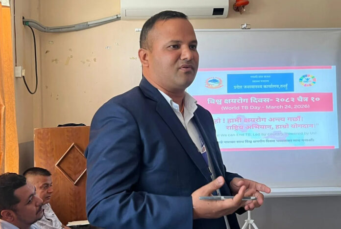 विश्व क्षयरोग दिवसको अवसरमा कार्यालयद्वारा सोमबार सञ्चारकर्मीसँग अन्तरक्रिया कार्यक्रममा बोल्दै कार्यालय प्रमुख दवाडीले समाजमा व्याप्त भ्रम हटाउन र रोग लुकाउने प्रवृत्ति अन्त्य गर्न पत्रकारहरूको भूमिका महत्वपूर्ण हुने बताउनुभयो । नियमित औषधी सेवन गरेमा क्षयरोग पूर्ण रूपमा निको हुने हुँदा सङ्क्रमण देखिएका व्यक्तिलाई धैर्यताका साथ पूर्ण मात्रा औषधी  सेवन गर्न सुझाव दिइएको थियो । फोटो क्याप्सन–अन्तरक्रिया कार्यक्रममा बोल्नुहुँदै प्रदेश जनस्वास्थ्य कार्यालयका प्रमुख अमर दवाडी । गोरखापत्र